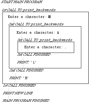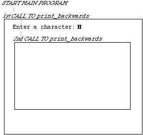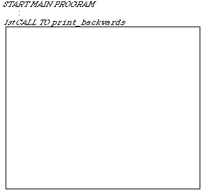 It is easy to see why Program 8.2.1 works with the aid of a few diagrams. When the main program executes, it begins with a call to "print_backwards()". At this point space is set aside in the computer's memory to execute this call (and in other cases in which to make copies of the value parameters). This space is represented as a box in Figure 8.3.1a: