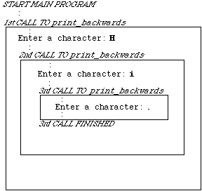 The process repeats, but inside the third call to "print_backwards()" a full-stop character is input, thus allowing the third call to terminate with no further function calls: