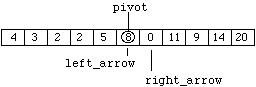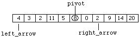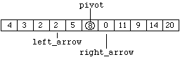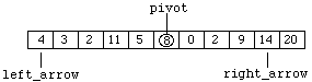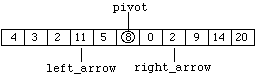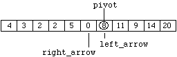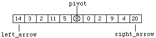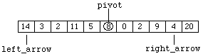 so that "left_arrow" and "right_arrow" initially represent the lowest and highest indices of the array components. Starting on the right, the "right_arrow" is moved left until a value less than or equal to the pivot is encountered. This produces: